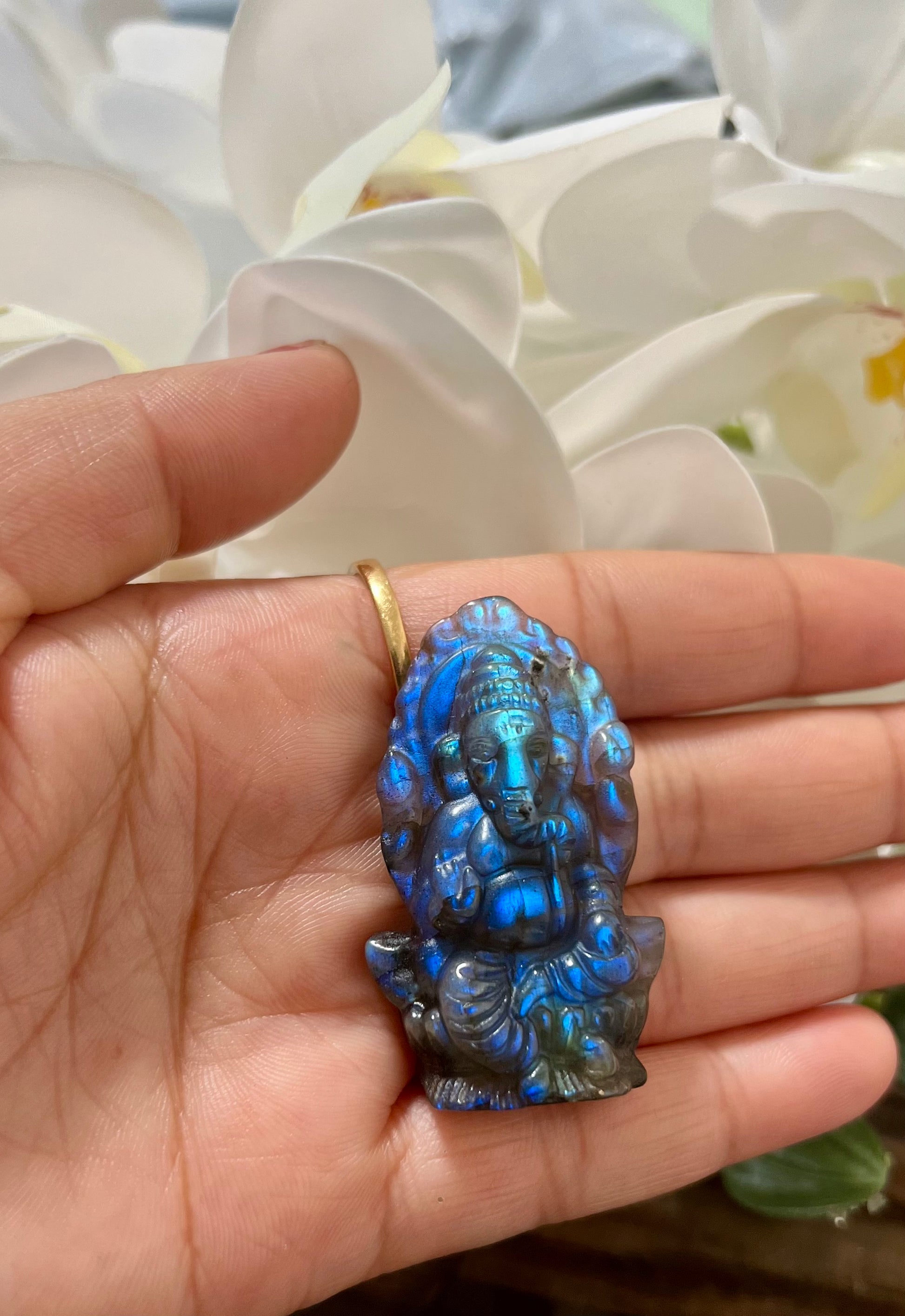 Labradorite Ganesha is a powerful fusion of divine wisdom and mystical energy. Lord Ganesha, the remover of obstacles and the god of new beginnings, finds a natural harmony in labradorite — a stone known as the Stone of Transformation and Magic. With its mesmerizing play of colours, labradorite is believed to awaken intuition, enhance spiritual insight, and shield the aura from negativity. When carved into the sacred form of Ganesha, it becomes a talisman of inner strength, clarity, and cosmic protection. This radiant figure not only blesses spaces with divine grace but also acts as a guardian for the soul, illuminating the path with wisdom, magic, and strength.
